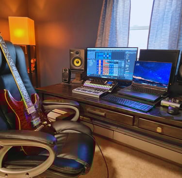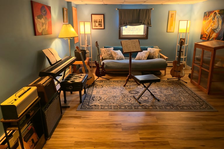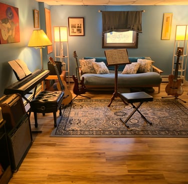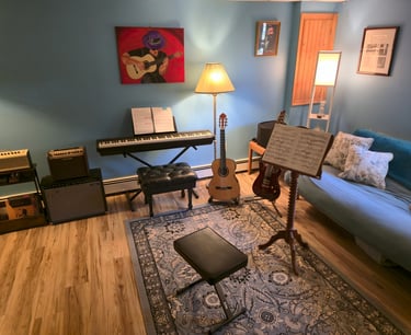 In addition to traditional instruction, I have a well-equipped teaching studio, including amplifiers, effects, and recording equipment, that allows us to explore tone, production, and musical context beyond what happens on the fretboard. The ability to record enables students to put what they are learning into practice, capturing their ideas and performances as fully produced recordings of their own playing.